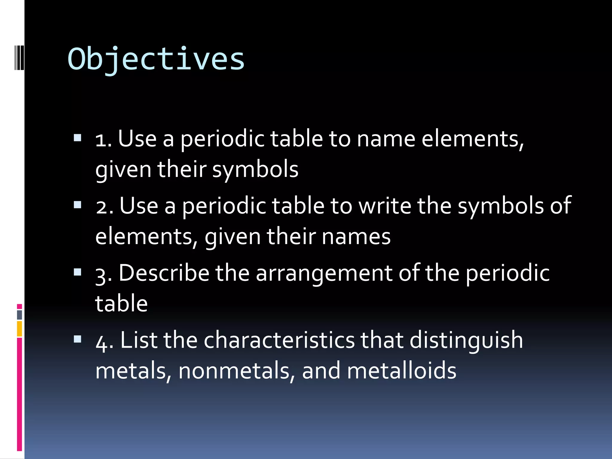 2. The periodic table arranges elements in groups and periods based on atomic number and similar properties. It distinguishes metals, nonmetals, and metalloids based on their physical properties like luster and conductivity.