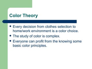 This document discusses color theory and principles of color. It covers topics such as color properties including hue, value, and intensity. It describes color mixing systems and color schemes. It discusses how color is perceived and how it can be used to create visual effects like emphasis, balance, and depth. It also covers concepts like emotional color, color symbolism, and the cultural meanings that can be associated with different colors.