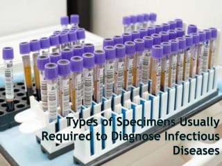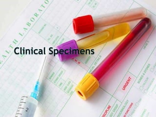 The clinical specimensthat are collected from patients are used to diagnose or follow the progress of infectious disease. The clinical specimens that are used to diagnose infectious diseases must be of the highest possible quantity.