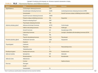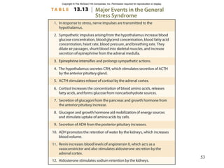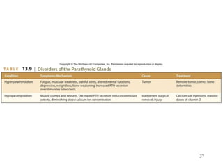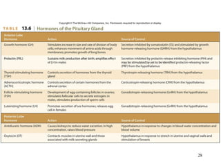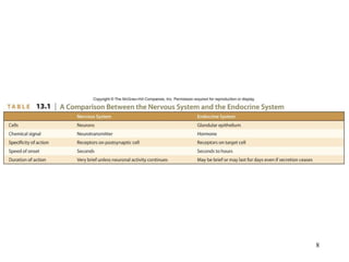 This document provides an overview of chapter 13 from Hole's Human Anatomy and Physiology textbook on the endocrine system. It describes the key endocrine glands including the pituitary gland, thyroid gland, parathyroid glands, adrenal glands, pancreas and others. It discusses how hormones are classified, their mechanisms of action, and control of hormonal secretions primarily through negative feedback. The stress response is also summarized.