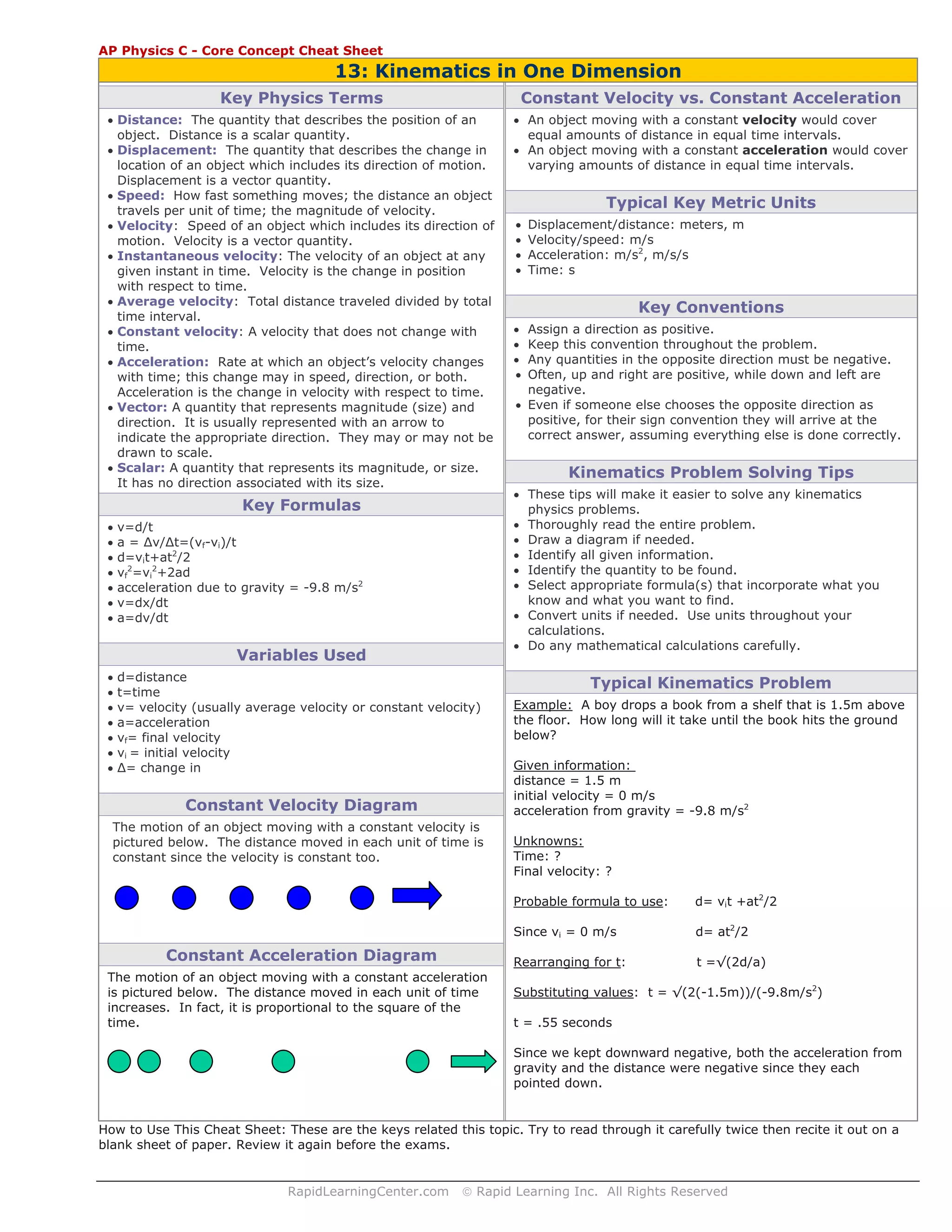 This document provides an overview of key concepts and formulas for kinematics in one dimension, including definitions of distance, displacement, speed, velocity, acceleration, and other related terms. It lists important formulas such as the equations for velocity, acceleration, displacement, and final velocity. Diagrams illustrate the differences between constant velocity and constant acceleration motion. The document concludes with tips for solving kinematics problems, including an example of calculating the time for a book to fall from a shelf.