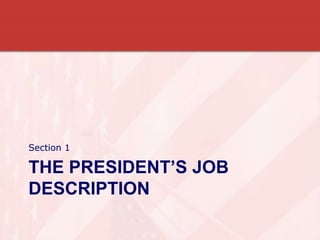 This document discusses the roles and qualifications of the U.S. President. It outlines the President's roles as chief of state, chief executive, chief administrator, chief diplomat, commander in chief, chief legislator, and chief citizen. The qualifications to be President are outlined as being at least 35 years old, a natural born U.S. citizen, and a 14 year resident of the United States. The document also discusses presidential terms in office, succession, the vice presidency, the framers' plan for electing the president, the nomination process, and the presidential election.