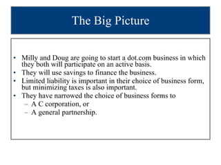 Milly and Doug are considering starting a dot-com business and need to choose between a C corporation or general partnership structure. They expect $200,000 in annual pre-tax earnings. As single filers with a 28% tax rate, an S corporation or LLC would minimize total taxes of $56,000, leaving $144,000 after-tax cash flow compared to $82,062 for a C corporation. The LLC offers additional flexibility over an S corporation.