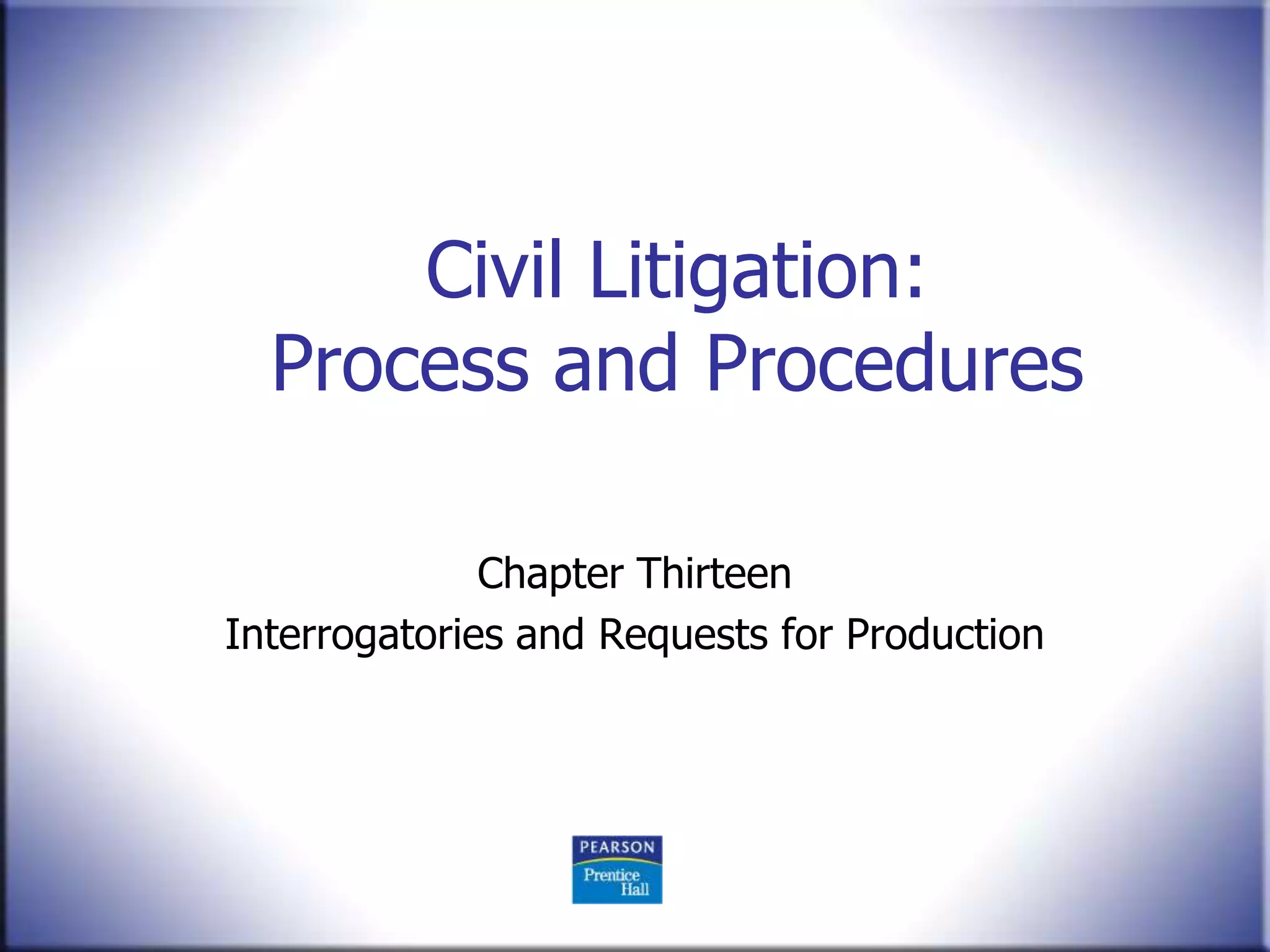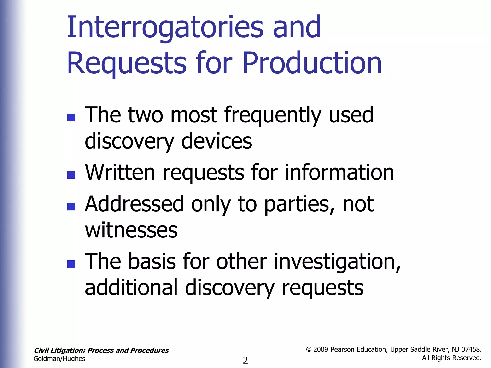 The document discusses interrogatories and requests for production, which are two commonly used discovery devices in civil litigation. Interrogatories are written questions that require sworn answers from parties. Requests for production require parties to provide documents, physical evidence, or access to inspect non-movable items. Both interrogatories and requests for production follow a standard format and are subject to objections for privileged or otherwise protected information.