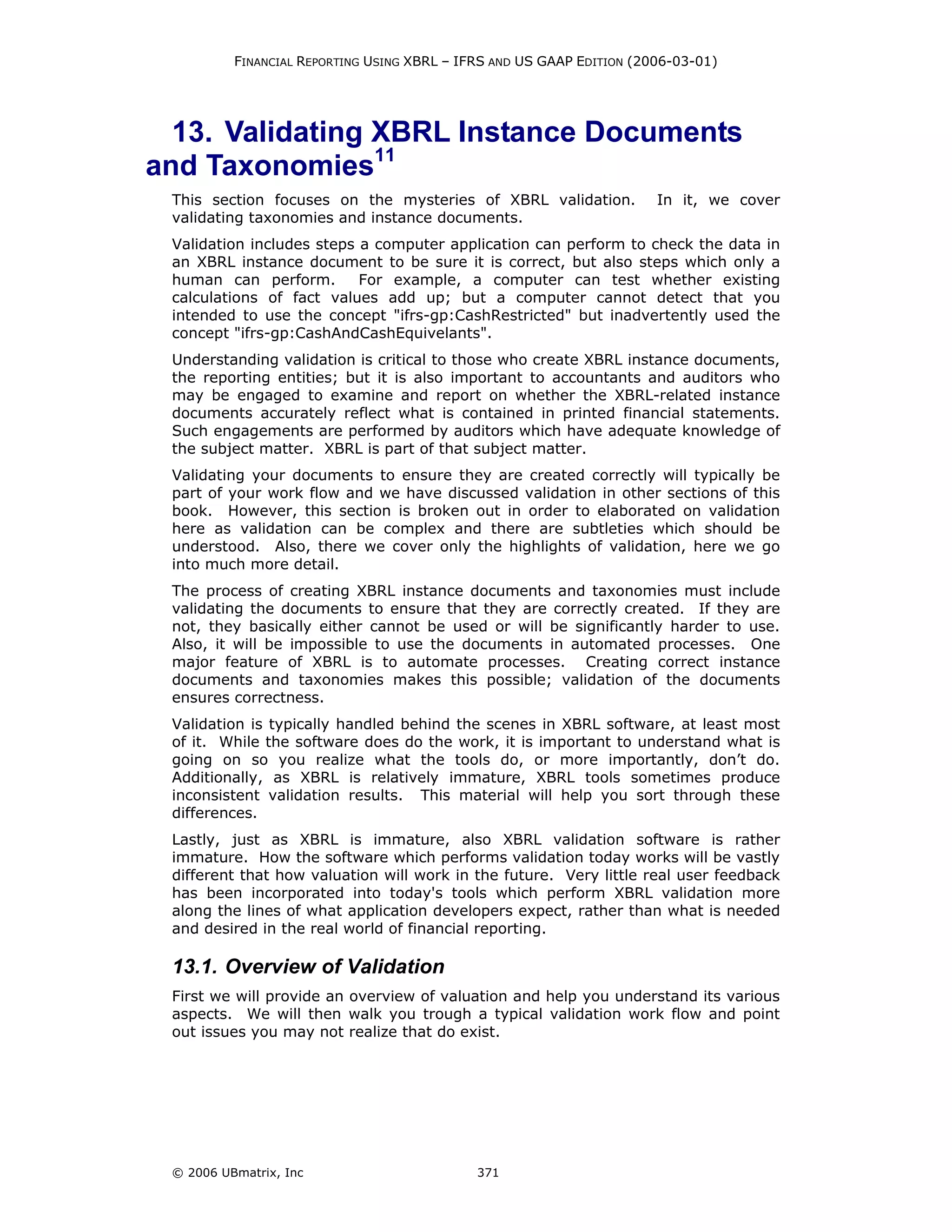 This document provides an overview of validating XBRL instance documents and taxonomies. It discusses the purpose of validation, which is to ensure documents are syntactically and semantically correct. It also covers the benefits of validation for automated exchange of business information, and potential problems that can occur with validation.