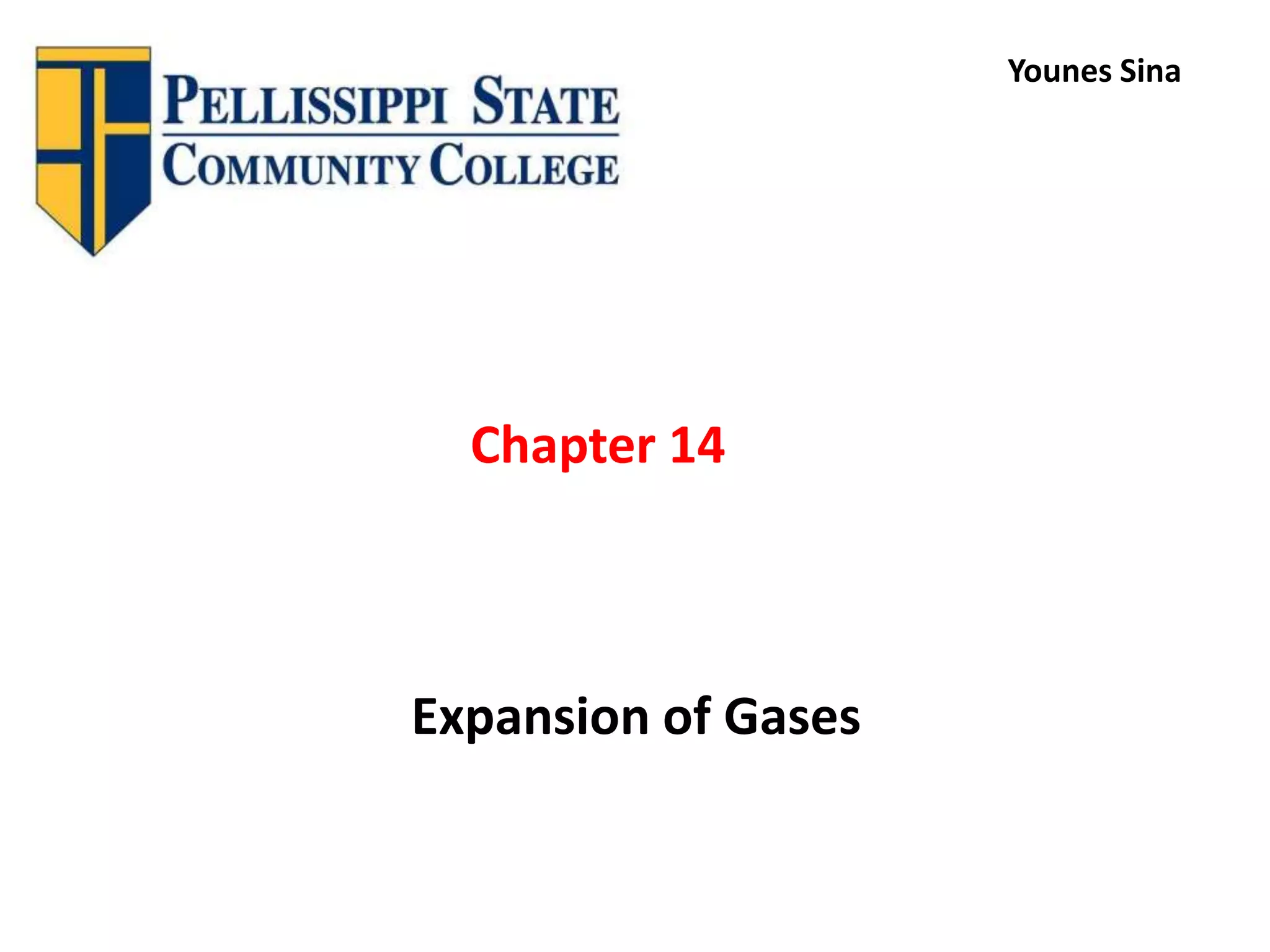 This document discusses the expansion of gases and the relationships between pressure, volume, temperature, and number of moles in gases. It introduces the ideal gas law (PV=nRT) and describes some key gas processes including isobaric (constant pressure), isothermal (constant temperature), and isometric (constant volume) processes. Examples are provided to demonstrate how to use the ideal gas law and gas equations of state to calculate pressure, volume, temperature, or number of moles given values of the other variables.