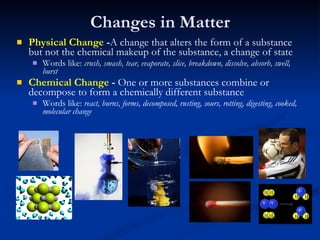 1. Physical changes alter the form or appearance of a substance without changing its chemical makeup, such as water evaporating or a rock being broken into pieces.