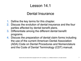 This document discusses dental insurance and benefits programs. It covers the key parties involved, including patients, dentists, carriers and sponsors. The two main types of dental benefit programs - indemnity and capitation - are described. Guidelines are provided for preparing and submitting paper and electronic dental claims forms, including using standardized codes and formats. The document also discusses topics like coordination of benefits, special programs like Medicaid, and guidelines for successful claims administration.