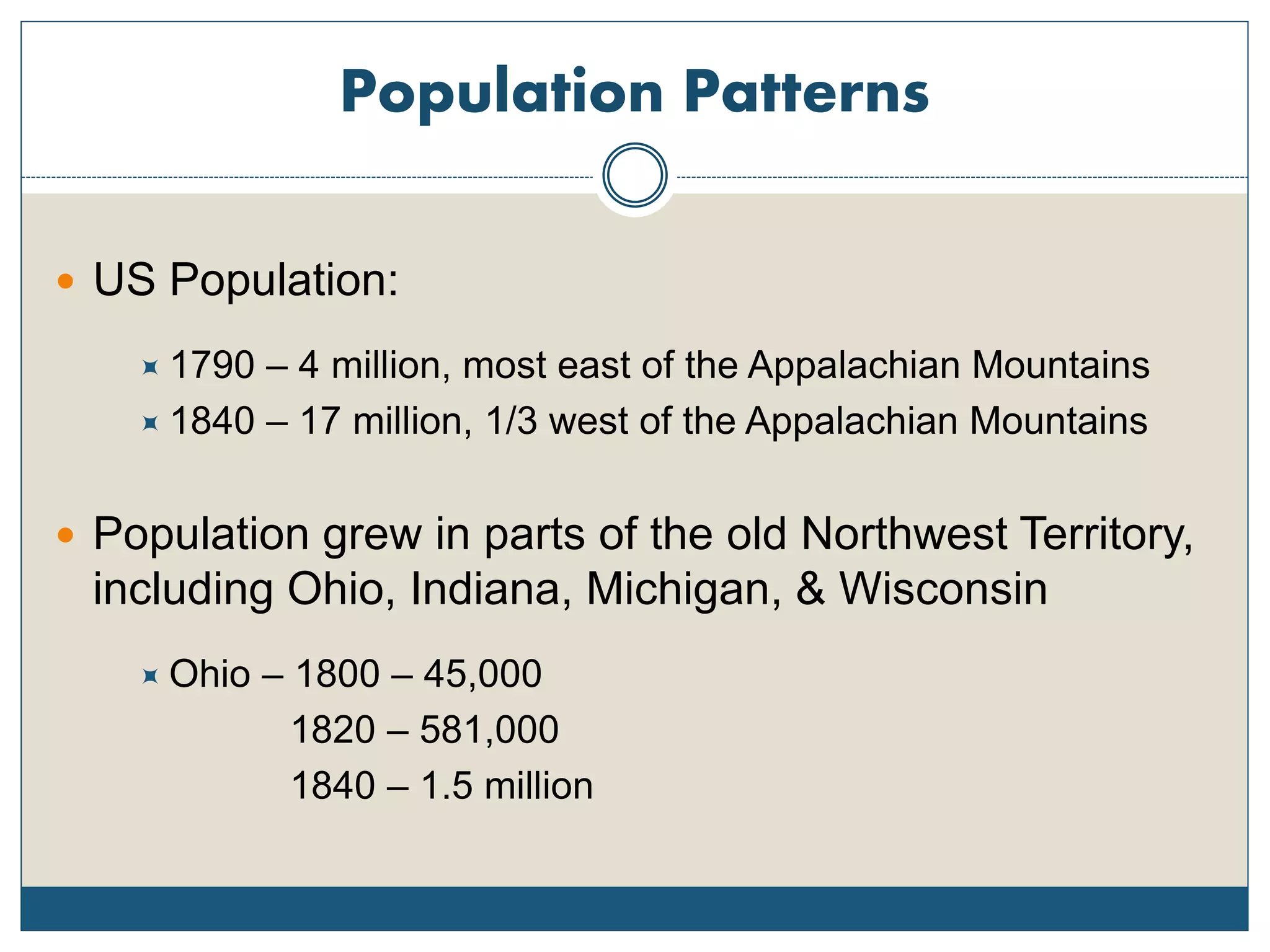 The document summarizes changes to American society and economy between 1790-1840. It saw a dramatic increase in population, especially in the Old Northwest territory including Ohio, Indiana, Michigan and Wisconsin. Farming transitioned from subsistence to commercial, fueled by new technologies and reliant on eastern and foreign markets. The cotton gin and slavery expanded in the Old Southwest. Transportation was revolutionized by steamboats, canals and emerging railroads. Textile mills concentrated in cities like Lowell, Massachusetts, while inequality grew between the urban rich and poor. High immigration rates increased ethnic tensions.
