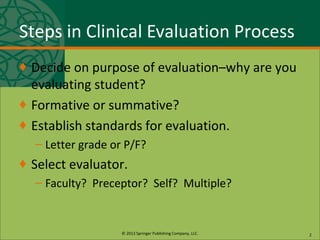 The document discusses various methods for evaluating nursing students' clinical performance, including observation, notes, checklists, rating scales, simulations, standardized patients, and objective structured clinical examinations. It provides guidance on selecting evaluation methods based on the competencies being assessed, ensuring validity and reliability, and improving the use of rating scales to reduce common errors in clinical evaluations.