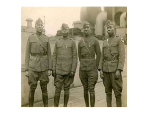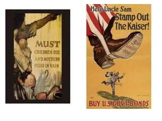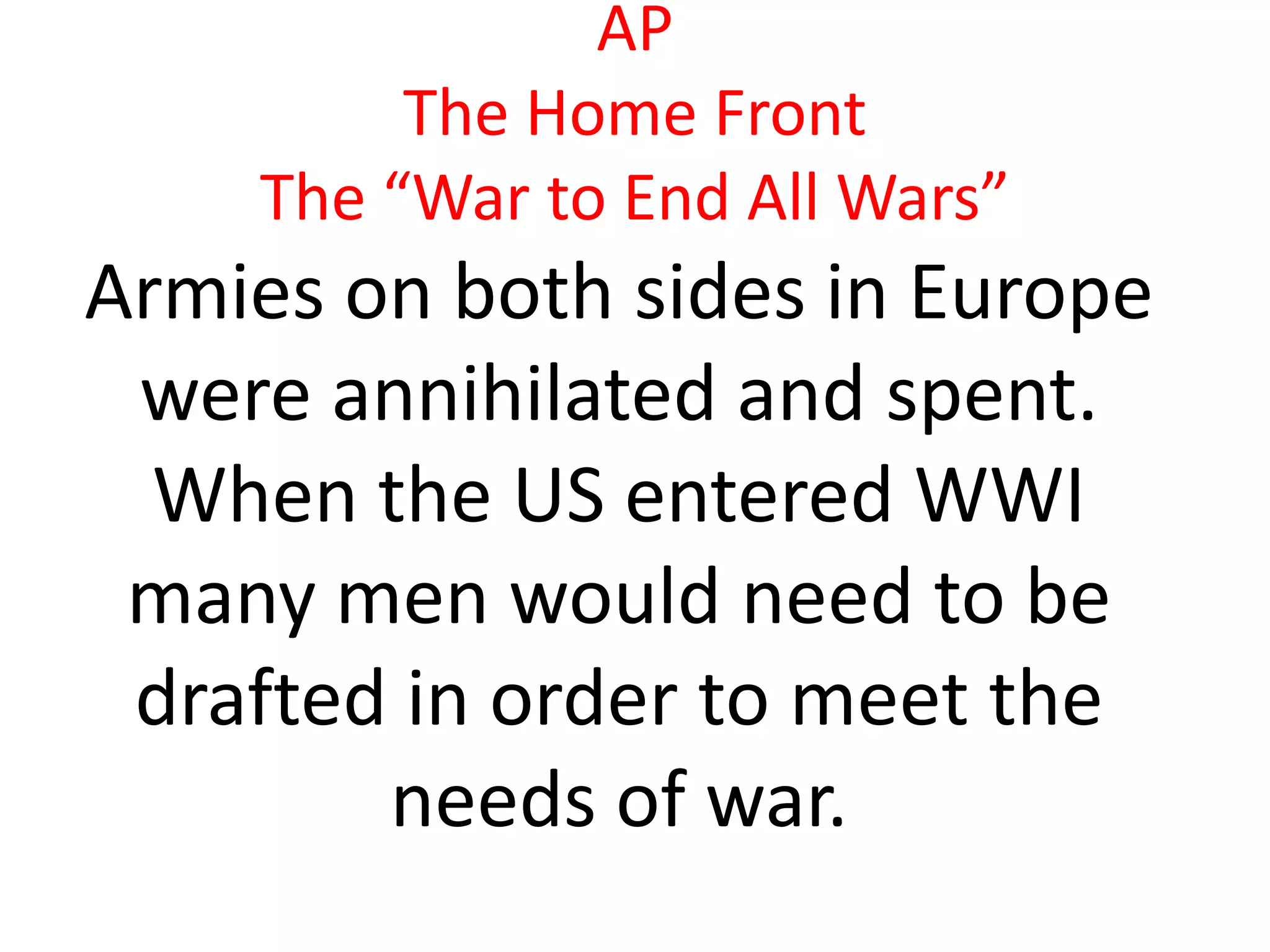 The US entered WWI in 1917 and needed to rapidly raise and equip an army. A draft was instituted that selected men ages 21-30. Nearly 2.8 million Americans were drafted and 2 million volunteered. African Americans faced discrimination but over 250,000 were still drafted. Women entered non-combat military roles for the first time. The government encouraged food conservation and raised funds through war bonds. The economy boomed as industry ramped up production and new migrants filled jobs. However, dissent was suppressed through propaganda and new laws restricting free speech.