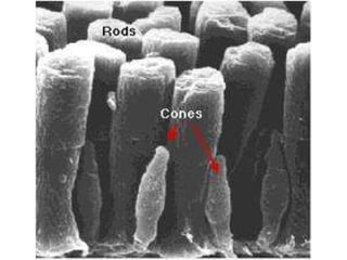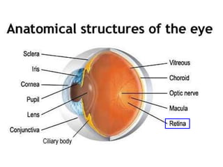 The document summarizes how light detection and vision work. Rods and cones in the retina detect light and send signals through the optic nerve to the brain. Rods function in dim light and detect black and white, while cones function in bright light and detect color. The highest concentration of cones is in the fovea centralis, allowing for sharpest vision. There is a blind spot where the optic nerve enters the eye containing no photoreceptors. The brain interprets the signals from the eyes to produce the correct orientation and size of images.