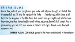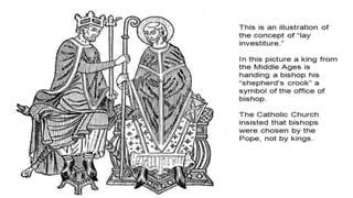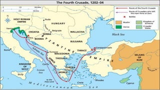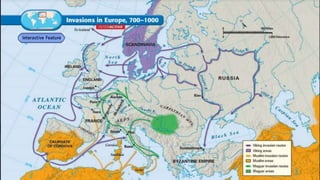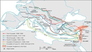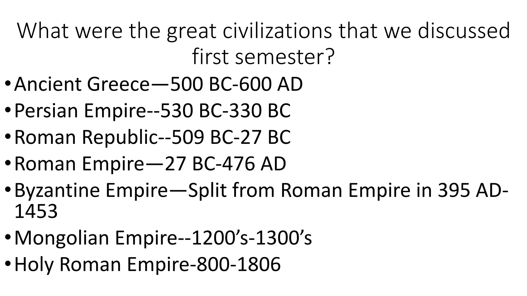 The document provides an overview of several major civilizations and empires from ancient history, including Ancient Greece, the Persian Empire, the Roman Republic and Empire, the Byzantine Empire, and the Mongolian Empire. It then discusses the Middle Ages in Europe, known also as the Medieval period or Dark Ages, and explains why this era is sometimes referred to as the Dark Ages due to raids and a lack of focus on learning. Finally, it covers several topics related to Christianity during this time period such as reforms in the Catholic Church, the development of architecture like Romanesque and Gothic cathedrals, and the Crusades launched by the Pope to recapture the Holy Land from Muslim rule.