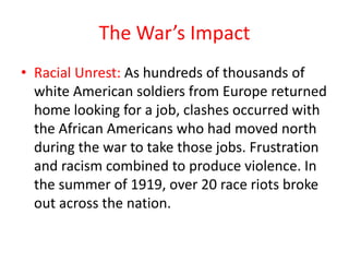 The 1920s was a decade of social and cultural change in the United States. Tensions arose between traditional and modern values as the nation grappled with issues like immigration, prohibition, religious fundamentalism, and racial unrest. At the same time, the economy and popular culture thrived with new innovations in art, literature, music, technology, and entertainment. The decade saw both conflict and prosperity as American society shifted in new directions.