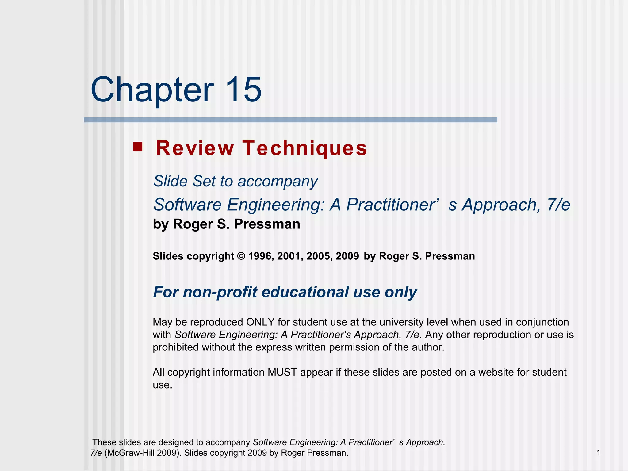 The document discusses different types of software review techniques, including informal reviews, formal technical reviews, and sample-driven reviews. It provides details on the goals, participants, and processes involved in formal technical reviews like walkthroughs and inspections. Metrics for evaluating the effectiveness of reviews are also presented, such as defects found per hour of preparation or inspection time. Overall, the document provides an overview of best practices and considerations for conducting effective software reviews.