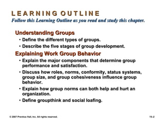 The document discusses understanding groups and teams in organizations. It defines different types of groups, describes the stages of group development, and explains how factors like roles, norms, conformity, and cohesiveness influence group behavior. It also discusses the advantages and disadvantages of group decision making. Teams are compared to groups, and characteristics of effective teams are listed. Current challenges in managing global teams and using social networks are also examined.