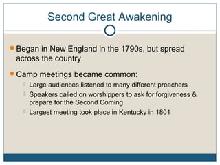 The Second Great Awakening sparked religious revivalism and the growth of utopian societies in early 19th century America. Mass camp meetings attracted thousands to hear preachers call for spiritual renewal. Reforms also aimed to address social problems through temperance, education, abolition, and women's rights movements. The era saw a rise in religiously-inspired reformers advocating for causes like banning alcohol, establishing public schools, and ending slavery.