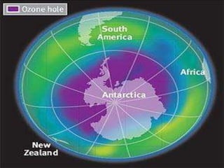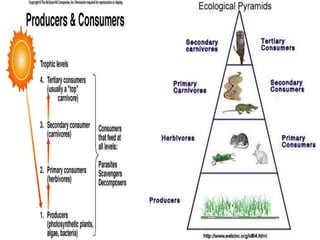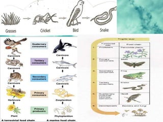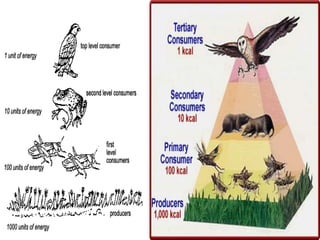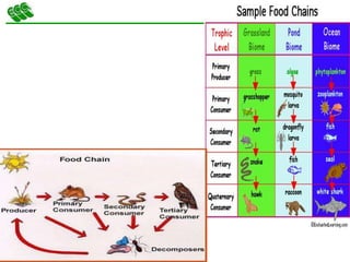 The document discusses ecosystems and how human activities impact the environment. It describes the components of an ecosystem like producers, consumers, decomposers and abiotic factors. There is a 10% loss of energy at each trophic level, limiting the number that can exist in a food chain. Human waste and chemicals like CFCs threaten ecosystems by polluting the air, water and soil. Improper waste disposal and ozone layer depletion are significant environmental issues addressed in the text.