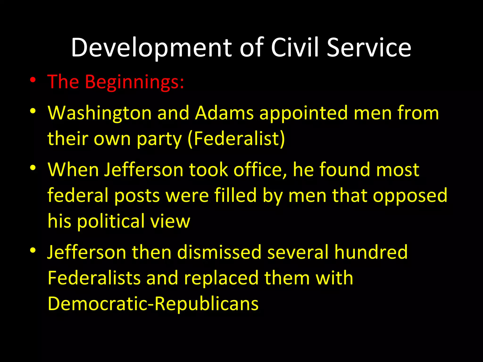 The document discusses the history and development of the US civil service system. It begins with presidents in the early 1800s appointing members of their own political party to federal posts. This practice of political patronage, or the "spoils system", led to many incompetent appointments and was reformed with the Pendleton Act of 1883 after President Garfield's assassination by a disappointed office seeker. The Act established merit-based hiring and protections against dismissal for political reasons. Today, the civil service system is governed by the Office of Personnel Management and employs over 2 million people across the country in a competitive, merit-based system.