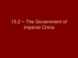 The document summarizes key aspects of government and bureaucracy in imperial China. It describes how the Mandate of Heaven justified overthrowing emperors for misrule. When the Han dynasty lost the mandate, China split into kingdoms before being reunited by the Sui dynasty. The civil service system selected officials through exams focused on Confucian teachings, but aristocrats still dominated. The Song dynasty allowed lower classes to serve, seeking the jobs' respect and tax exemptions. Mongol rule appointed foreigners to positions, reducing Chinese scholars to minor roles until reforms revived the exam system.