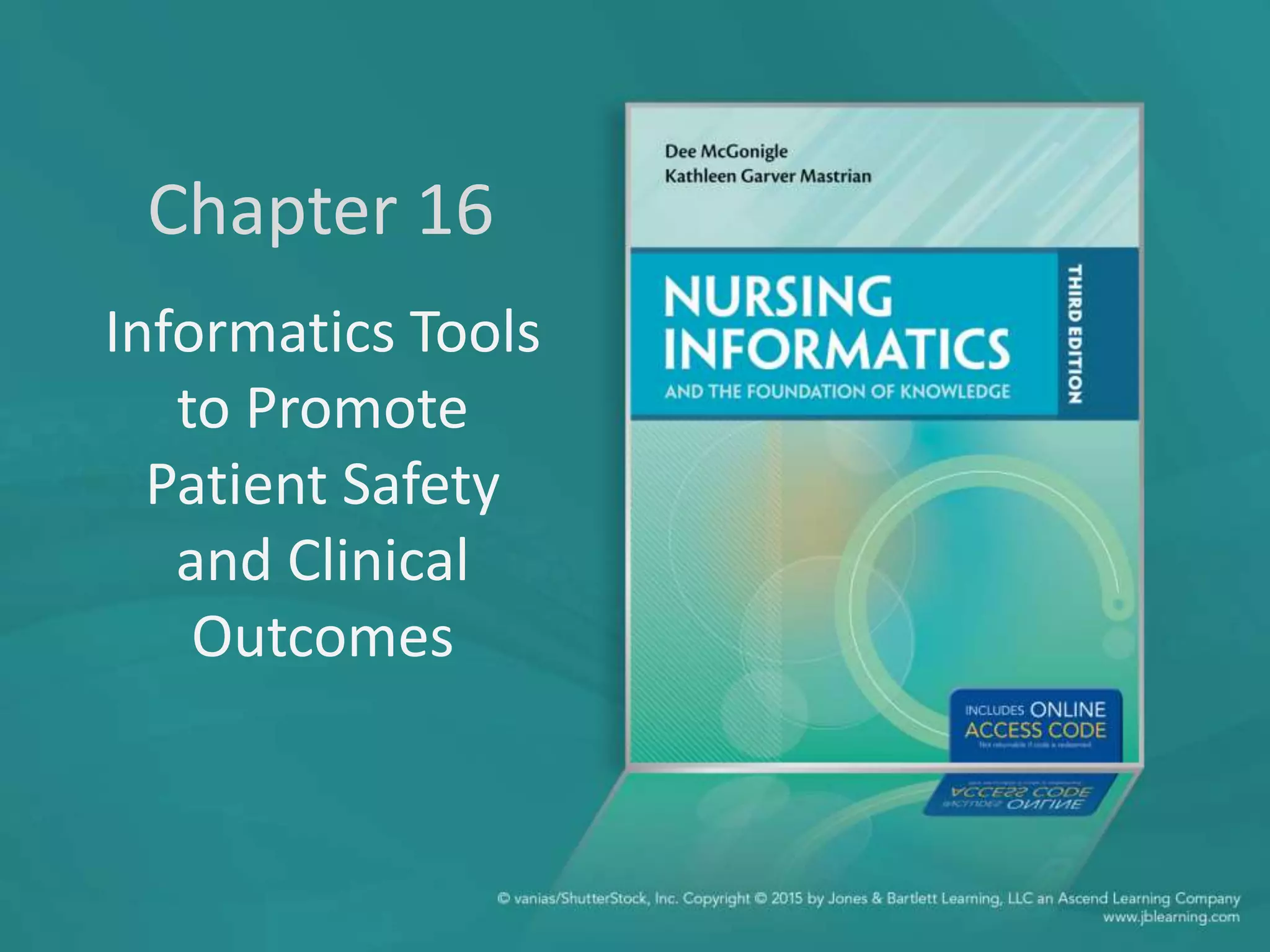 Nursing professionals have an ethical duty to ensure patient safety. Various safety initiatives and technologies have aimed to promote safety and reduce errors. Informatics tools can integrate into the medication administration cycle through technologies like computerized physician order entry, barcoded medication administration, smart pumps, and clinical decision support. These technologies perform checks, provide alerts, and assist with decisions to help ensure the five rights of medication administration and reduce human errors.
