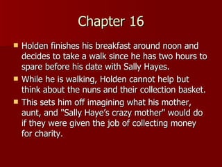 Holden finishes breakfast and takes a walk, thinking about nuns collecting donations. He imagines what his mother and aunt would be like as charity collectors. While walking on Broadway, he hears a young boy singing happily to himself, which lifts Holden's mood. He buys a record for his sister Phoebe. Unable to find Phoebe in Central Park, he takes a taxi to meet his date, Sally Hayes, at the Biltmore hotel.