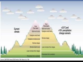 Climate is determined by averaging temperature, precipitation, humidity, air pressure and sunshine over many years. It influences what plants and animals can survive and how people live. Several factors affect climate, including latitude, with warmer temperatures near the equator and cooler temperatures closer to the poles. Ocean currents and large bodies of water influence coastal climates, and elevation impacts climate with colder temperatures at higher altitudes and wetter climates on the windward sides of mountains. Cities also impact local climate by absorbing more solar radiation than surrounding areas.