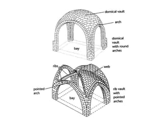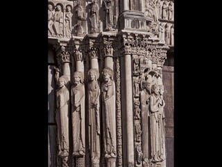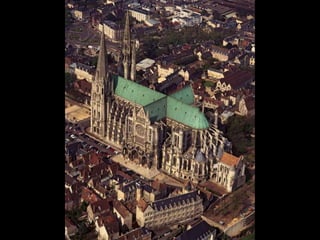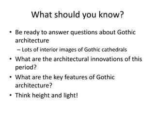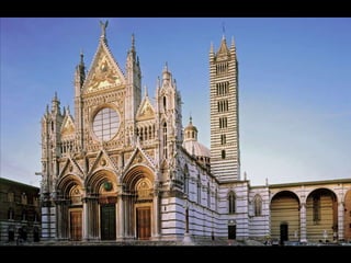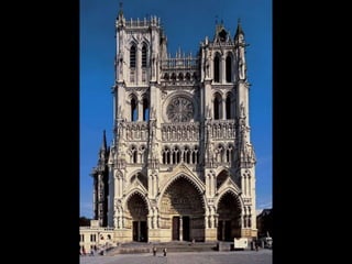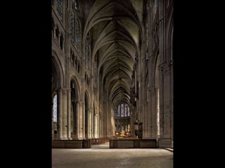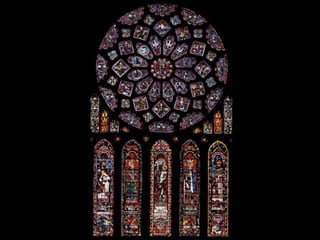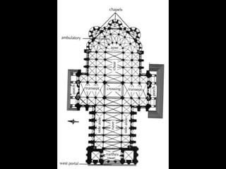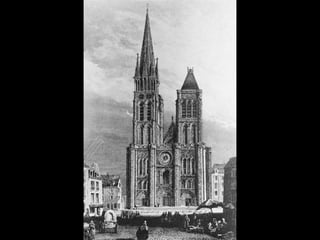 The document summarizes Gothic art of the 12th and 13th centuries in France, England, Germany, and Italy. Key innovations included stained glass windows, flying buttresses, rib vaulting, and pointed arches, which allowed for taller buildings with more light. Abbot Suger at Saint-Denis pioneered these Gothic styles focused on light and height to inspire spirituality. Gothic architecture then spread with regional variations to other countries like ribbed vaults developing further in England and sculpture gaining independence in Germany.