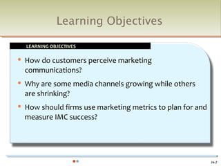 This document provides an overview of integrated marketing communications (IMC). It discusses key concepts like how consumers perceive communications, the growth of some media channels and decline of others, and how firms can use marketing metrics to plan and measure IMC success. Specific topics covered include the AIDA model of promoting awareness, interest, desire and action; various IMC elements like advertising, personal selling, sales promotions, direct marketing and public relations; and methods for measuring IMC success.