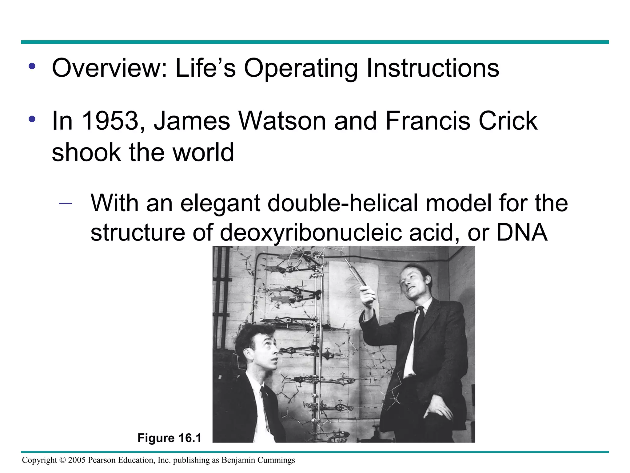 The document describes DNA structure and replication. It begins by discussing early evidence that DNA is the genetic material, including Griffith's experiments showing bacterial transformation and Hershey and Chase's experiments tracing phage DNA and proteins during infection. Watson and Crick then developed the first accurate double-helix model of DNA structure in 1953 based on Franklin's X-ray crystallography images, with base-pairing of A-T and C-G. The document concludes by explaining that DNA replication involves unwinding the double helix and using each strand as a template to build new complementary strands based on base-pairing rules, with many proteins involved.
