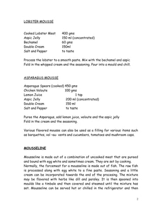 Mousse, mousseline, and quenelle are all types of forcemeats made with meat, fish, or vegetables that are pureed and bound together. A mousse is made with cooked ingredients mixed with a binding agent like gelatin and cream. Mousseline uses uncooked meat or fish pureed with egg whites and sometimes cream, then set by cooking. Quenelles are shaped from a raw fish forcemeat mixed with egg whites, then poached before serving. All three can be made with different ingredients but follow a similar preparation process of pureeing and binding ingredients.
