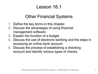 This document provides an overview of financial systems used in dental practices, including electronic banking, budgets, financial management software, payroll records, and tax responsibilities. It discusses establishing checking accounts and using online banking to pay bills and view balances. The document also covers reconciling bank statements, using petty cash, and maintaining accurate payroll records, withholding taxes correctly, and retaining records as required by law.