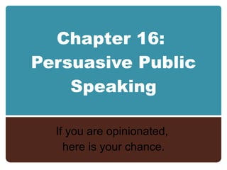 Chapter 16 discusses persuasive public speaking, emphasizing the importance of speaker credibility (ethos), logical arguments (logos), and psychological appeals (pathos) in crafting an effective speech. It outlines the components of persuasive speeches, various logical fallacies to avoid, and methods to effectively present one's point of view. Additionally, it introduces models like Monroe's motivated sequence and factors that influence audience persuasion such as social support and individual norms.