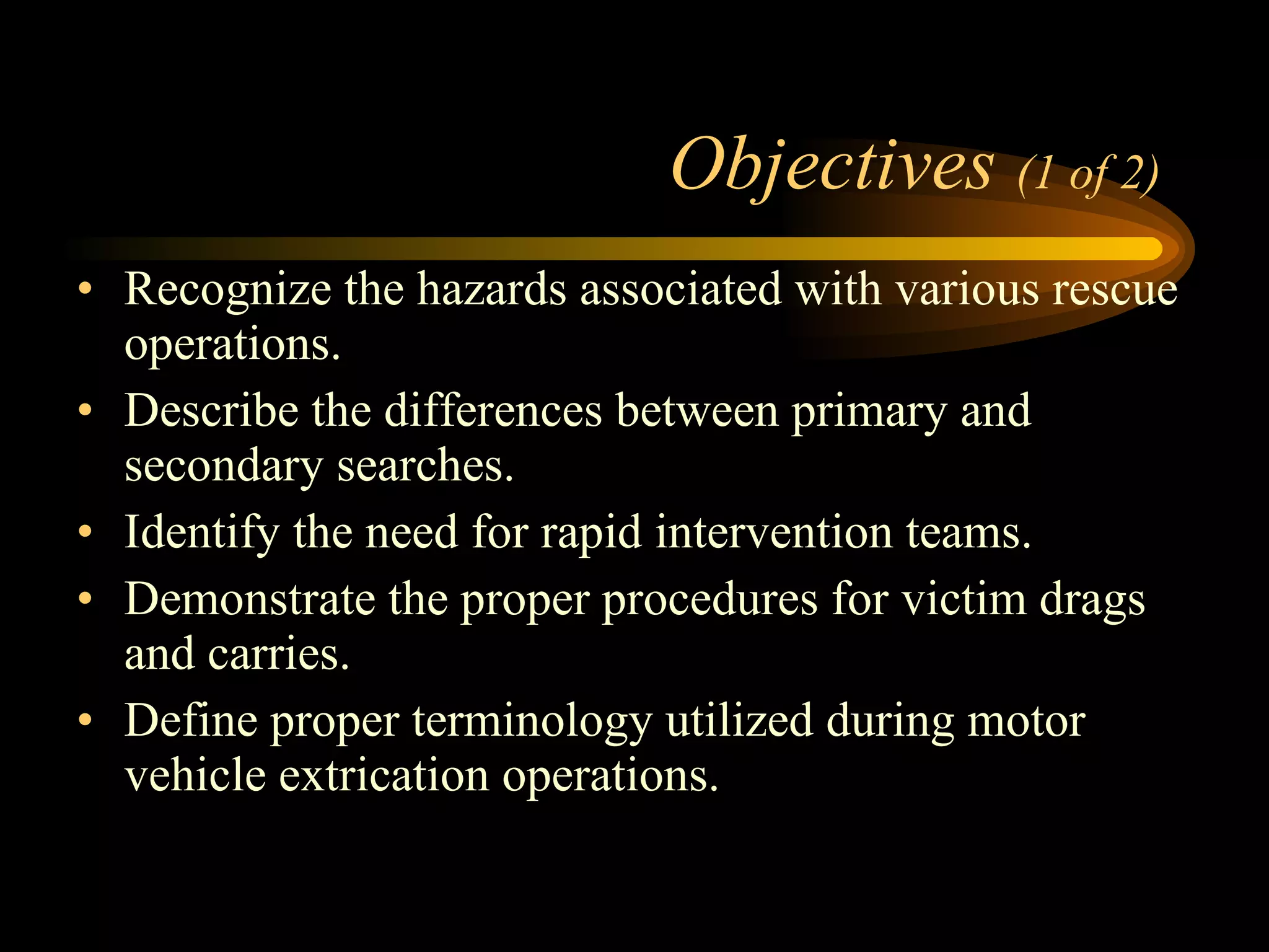 This document provides an overview of rescue procedures and specialized rescue situations. It describes the differences between primary and secondary searches of burning structures. It also discusses victim removal techniques like drags and carries. The document outlines motor vehicle extrication procedures and lists common extrication tools. Finally, it briefly introduces several specialized rescue situations like vertical, water, structural collapse, trench, confined space and others that require additional training beyond basic rescue procedures. Safety is emphasized and specialized training is advised before attempting more complex rescues.