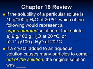 This document provides a review of key concepts from Chapter 16, including solubility, supersaturated solutions, colligative properties, factors that affect solubility, and calculations involving molarity, molality, mass percent, and volume percent in solution concentration problems. It contains multiple choice and open response questions about these topics.