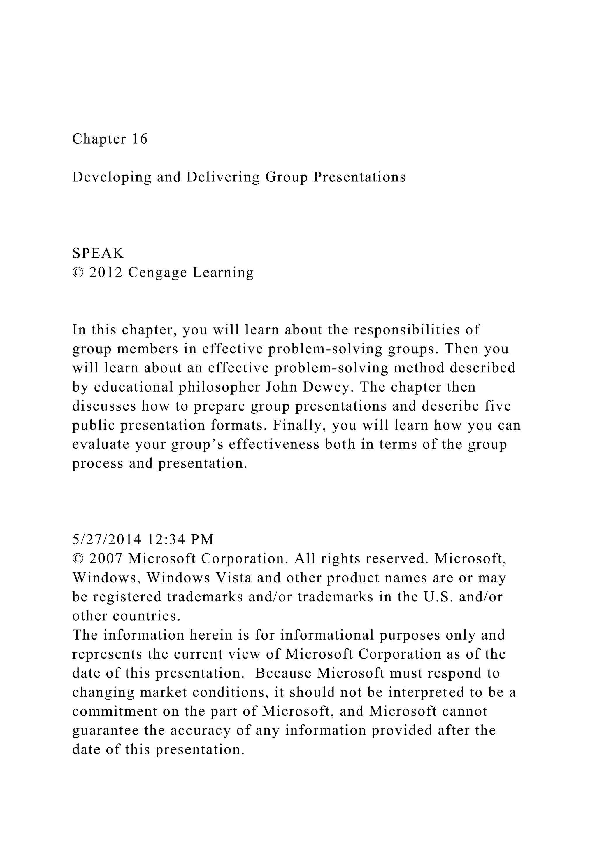 Chapter 16 discusses the roles of group members in effective problem-solving groups and outlines John Dewey's systematic problem-solving method. It includes guidelines for preparing group presentations, evaluating group effectiveness, and managing conflicts within teams to achieve synergy. The chapter emphasizes the importance of collaboration and individual commitment to group goals in a variety of presentation formats.