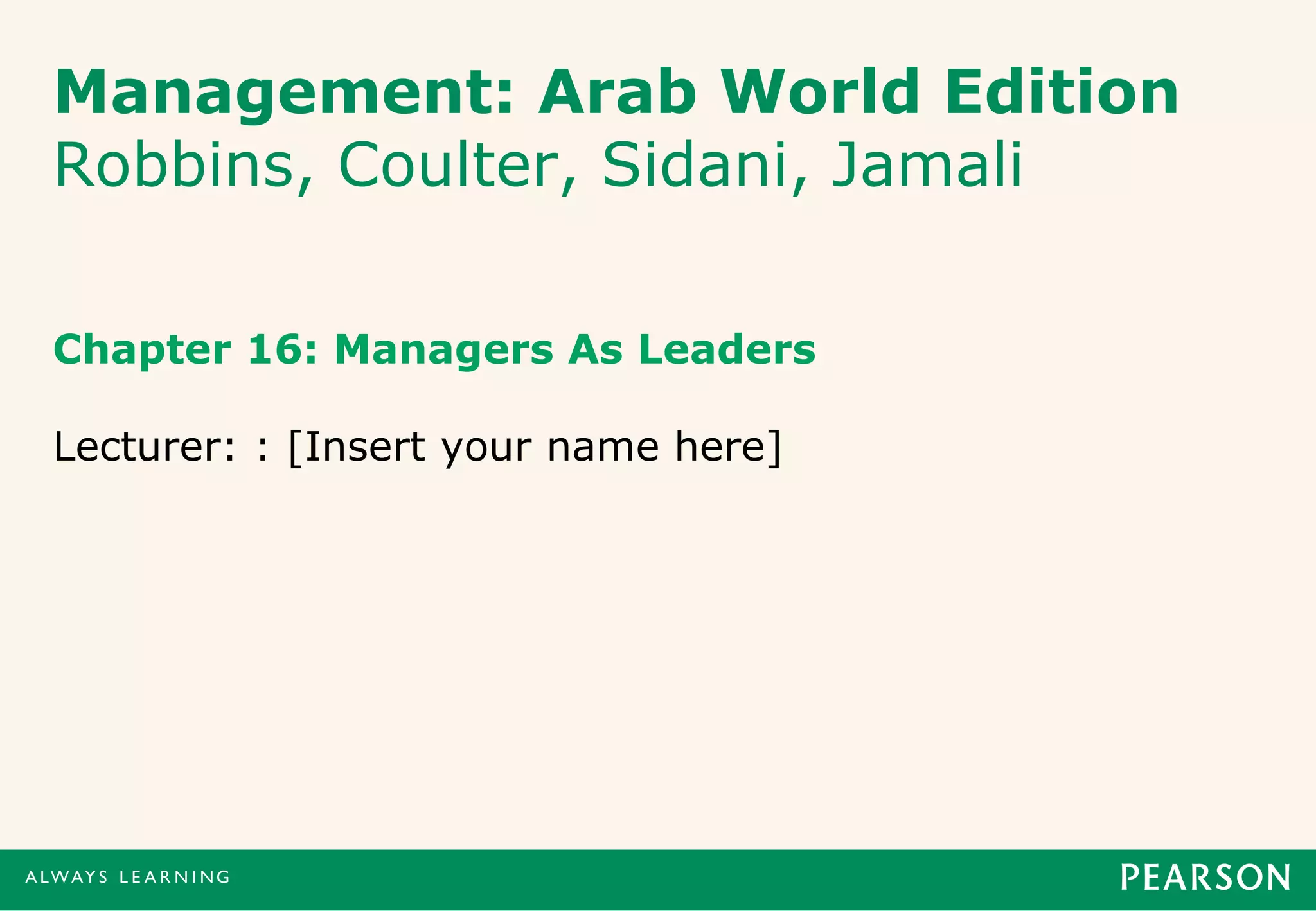 This document provides an overview of key topics and concepts from Chapter 16 of the textbook "Management: Arab World Edition" by Robbins, Coulter, Sidani, and Jamali. The chapter discusses definitions of leaders and leadership, historical models of leadership in the Middle East, early theories of leadership traits and behaviors, contingency theories of leadership, contemporary views of leadership styles, and issues facing 21st century leaders. Key points covered include Ibn Khaldun's conception of leadership, behavioral leadership theories from various universities, Fiedler's contingency model, situational and path-goal leadership theories, and distinguishing between transactional and transformational leadership.