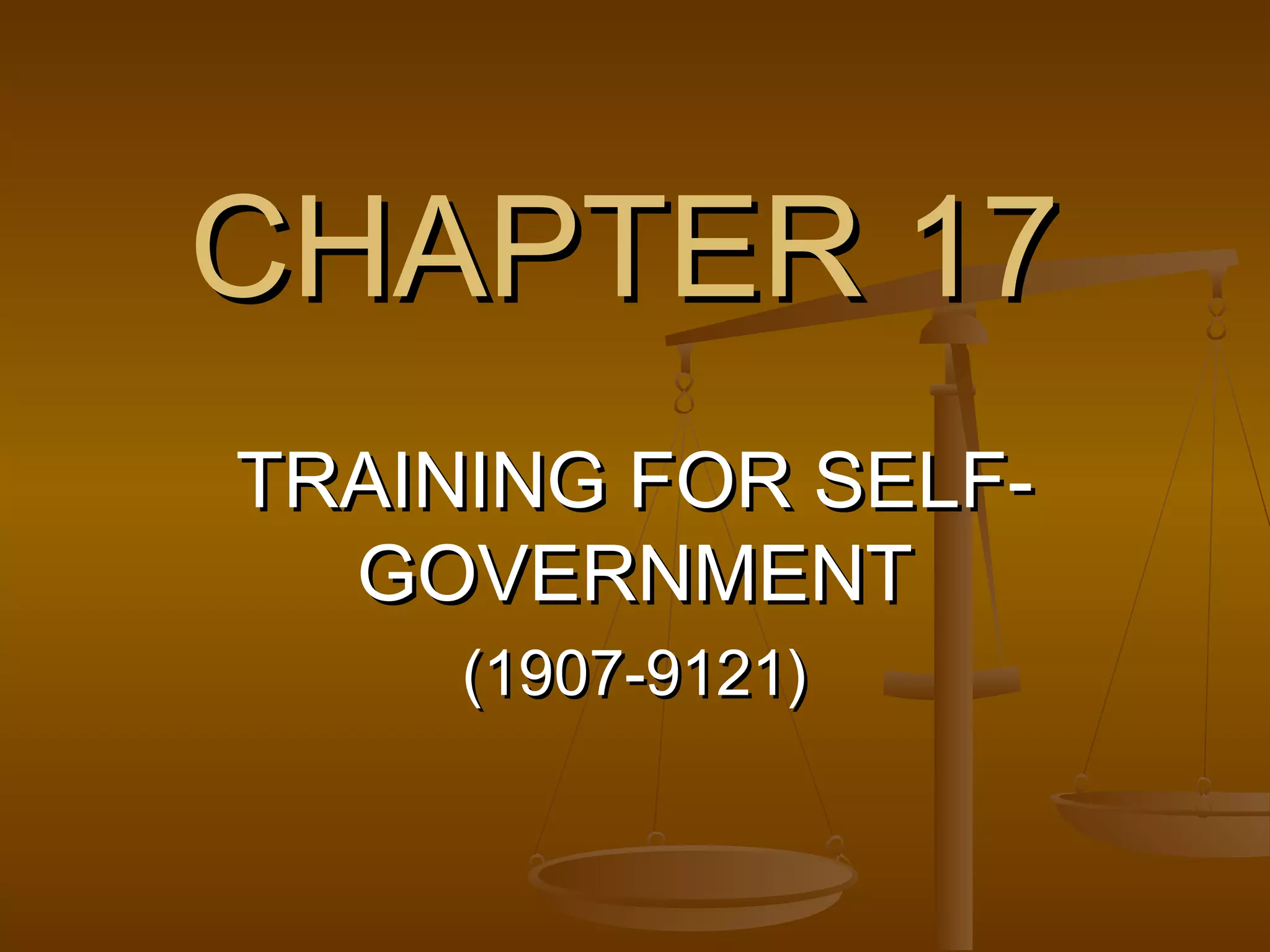 The document summarizes the American efforts to train Filipinos in self-government in preparation for independence. It discusses how the Americans established local governments and gradually increased Filipino participation and control over political institutions. It describes laws passed by the Philippine Commission that set up provincial and municipal governments and expanded voting rights. It also explains how Americans like Governor-General Francis Burton Harrison promoted placing more Filipinos in government positions to prepare them for eventual self-rule.