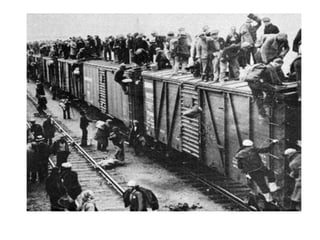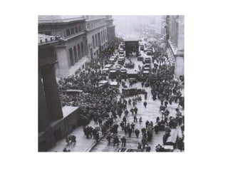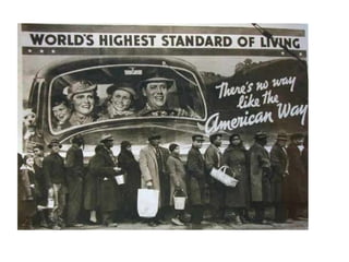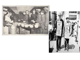 The Great Depression began after the stock market crash of 1929 and lasted throughout the 1930s. Several factors contributed to the Depression, including overproduction, uneven income distribution, declining exports, and mistakes by the Federal Reserve. During the Depression, nearly 25% of the workforce was unemployed, many families lived in poverty with breadlines and soup kitchens, and some people became homeless hobos traveling the country. The Dust Bowl drought exacerbated the farming crisis and caused many to flee to California. President Hoover did not take action to help Americans suffering from the economic collapse.