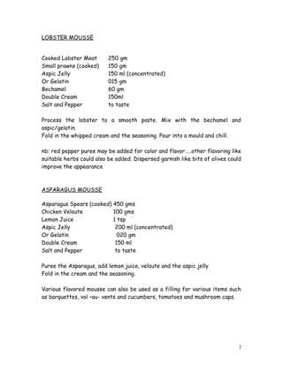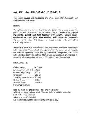 This document defines and provides recipes for mousses, mousselines, and quenelles. Mousses are mixtures of cooked ingredients blended with a binding agent like gelatin and enriched with cream. Mousselines are made from raw meat or fish blended with egg whites and cooked. Quenelles are similar but shaped into oblong forms and poached before serving. Recipes for lobster mousse, asparagus mousse, and cod quenelles are included as examples.