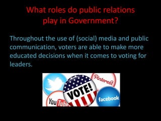 Public relations plays an important role in government at all levels. At the federal level, the President and his staff receive significant media attention to communicate their agenda to citizens. State governments also use public relations to promote tourism and inform constituents. Local governments employ information specialists to keep communities aware of news and issues. Election campaigns are a major focus of public relations, with spending on presidential races increasing from $2.6 billion in 2000 to $6 billion in 2012. Social media allows more voters to be informed and engaged in the political process.