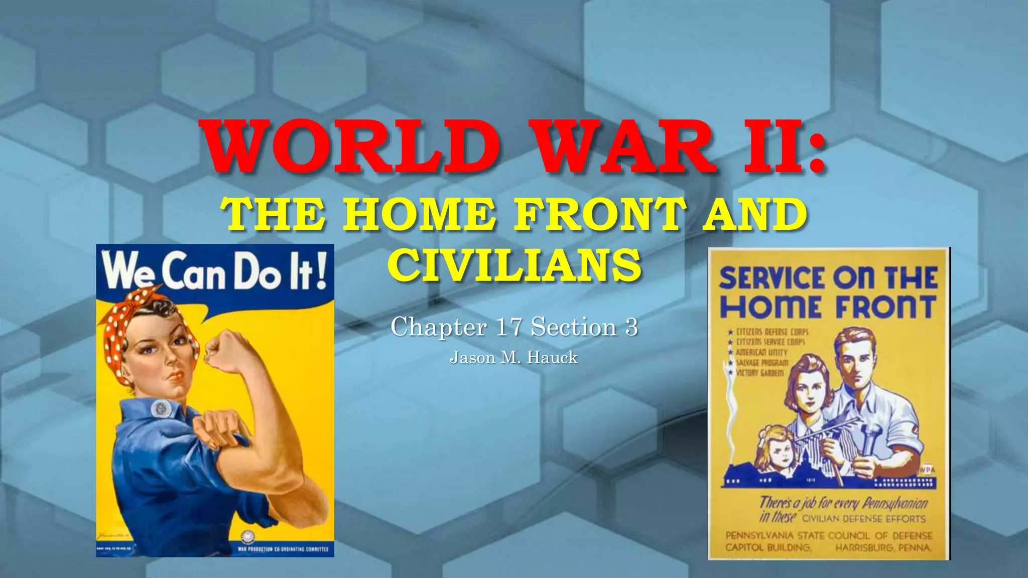 The document summarizes the impact of World War II on civilian populations around the world. It describes how the Soviet Union, United States, Germany, Japan, and Britain all mobilized their societies and economies for total war. This led to shortages, social disruption, and the bombing of cities. Millions of civilians died from bombing campaigns, food shortages, and forced relocations. While the bombing did not destroy civilian morale, it did undermine the enemy's ability to sustain its war effort.