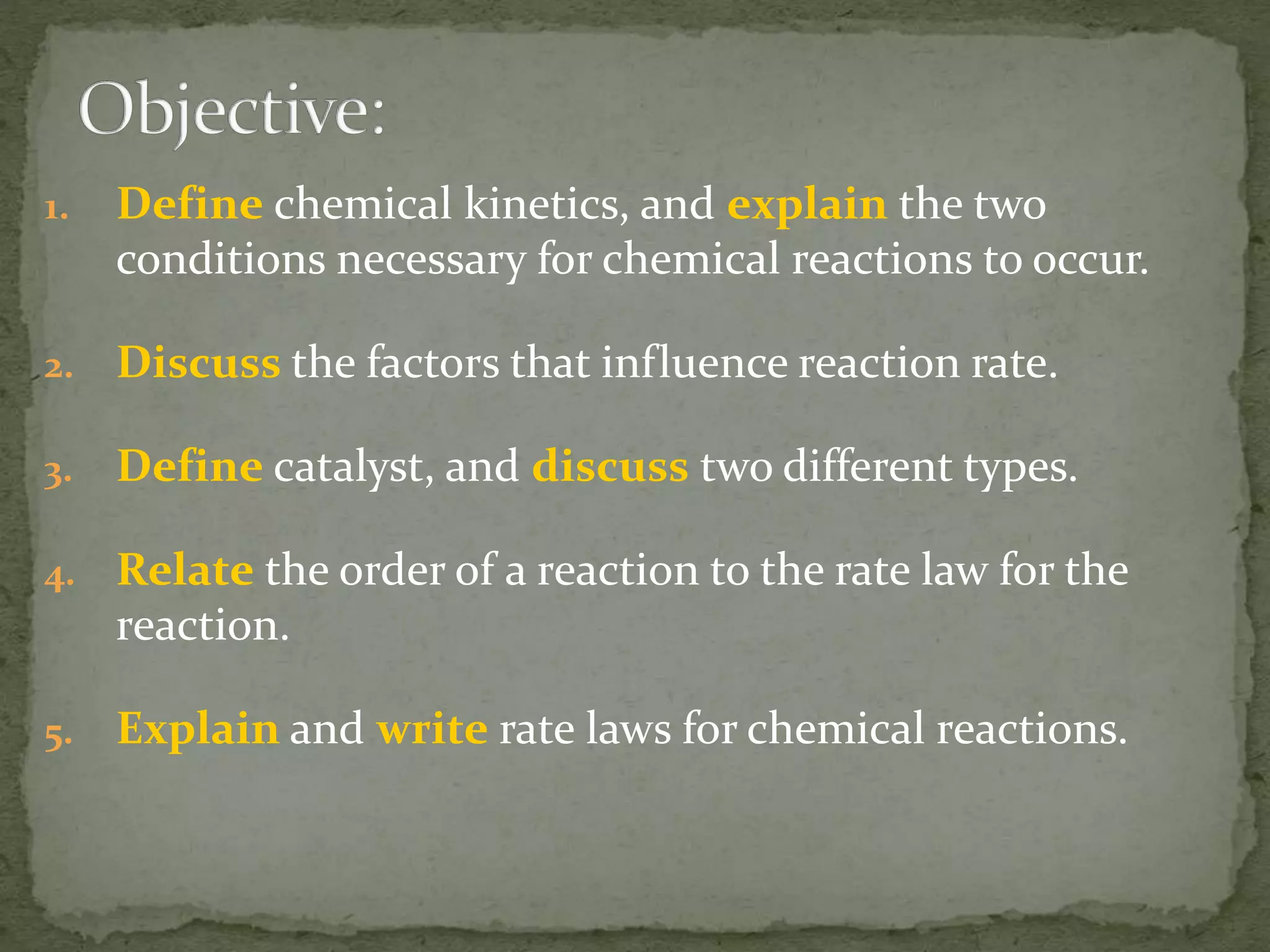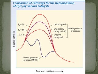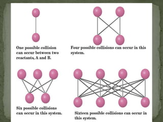 This document provides information about chemical kinetics and reaction rates. It defines chemical kinetics and discusses the two conditions needed for reactions to occur: contact between particles and enough energy for activation. Reaction rate depends on collision frequency and efficiency of reactants and is influenced by nature of reactants, surface area, temperature, concentration, and presence of a catalyst. It also defines catalysts and different types. The relationship between reaction rate and concentration is given by the rate law, and order of a reaction relates to its rate law. Rate laws are written for different reaction examples and mechanisms.