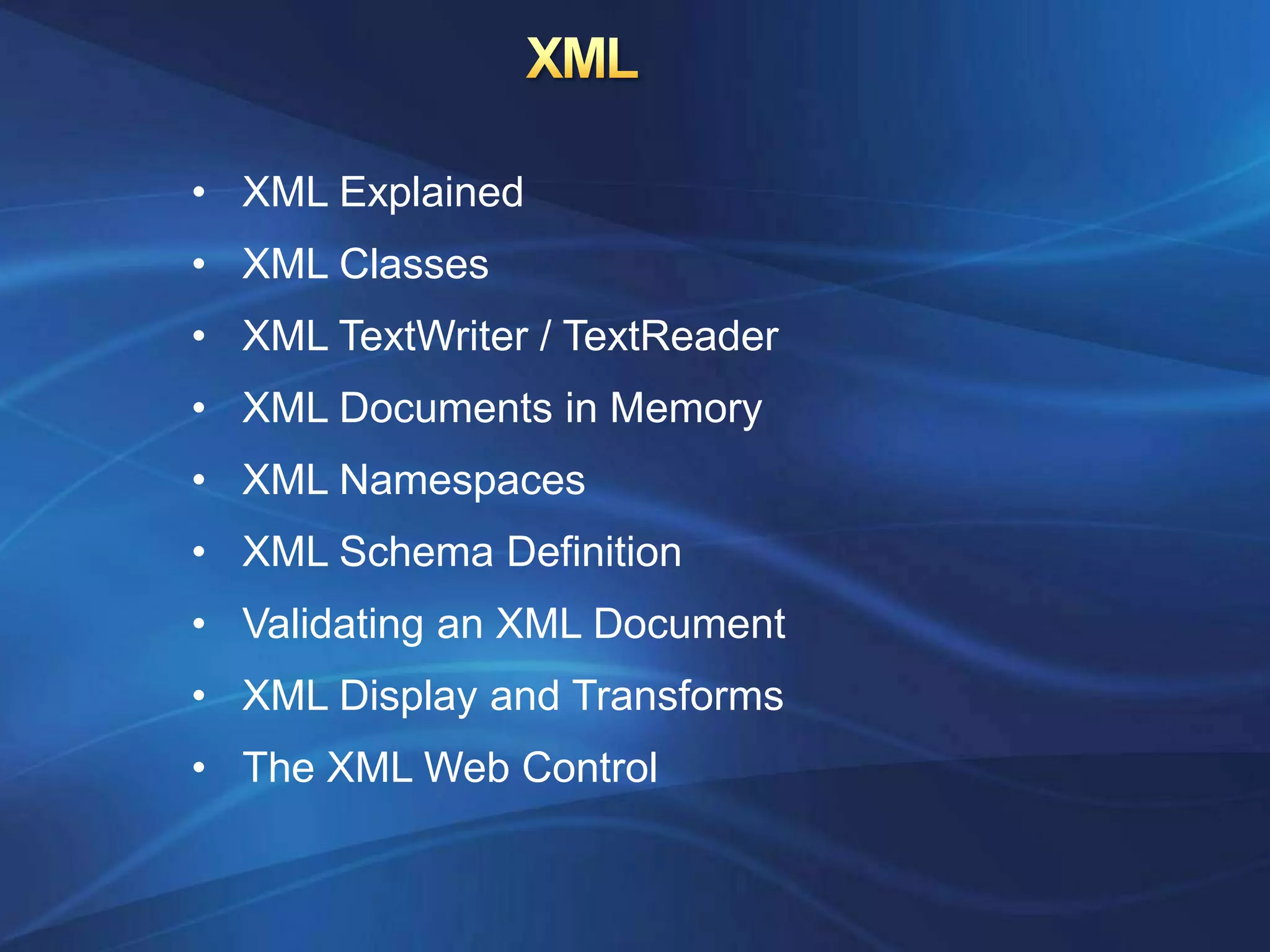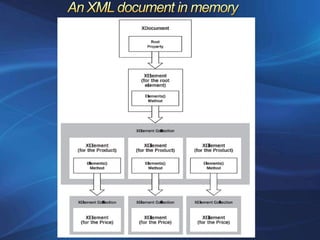 - .NET provides classes for reading, writing, manipulating, and validating XML documents. This includes XmlTextReader/Writer for file access and XDocument for in-memory objects.