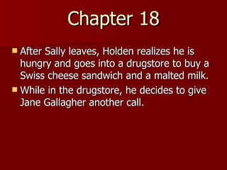 Holden goes to a drugstore to buy food. He tries calling Jane Gallagher but no one answers. He only has three contacts in his address book: Jane, his old teacher Mr. Antolini, and his father's office number. He decides to call his acquaintance Carl Luce who he arranges to meet for a drink at 10pm. To pass the time until then, Holden sees a movie about a man who loses his memory in war. After, he thinks about war as he walks to meet Carl, recalling his brother's negative experience in the army during World War 2.