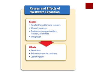 The document provides an overview of how mining, ranching, and railroads transformed the American West in the late 1800s. It describes how the discovery of minerals like gold and silver led to mining booms and the growth of boomtowns. Meanwhile, the cattle industry expanded across the Great Plains, relying on cowboys to drive cattle to markets. To facilitate transportation, the first transcontinental railroad was completed in 1869, connecting the eastern and western United States by rail. Western expansion put pressure on Plains Indian tribes, leading to conflicts as settlers encroached on their lands.