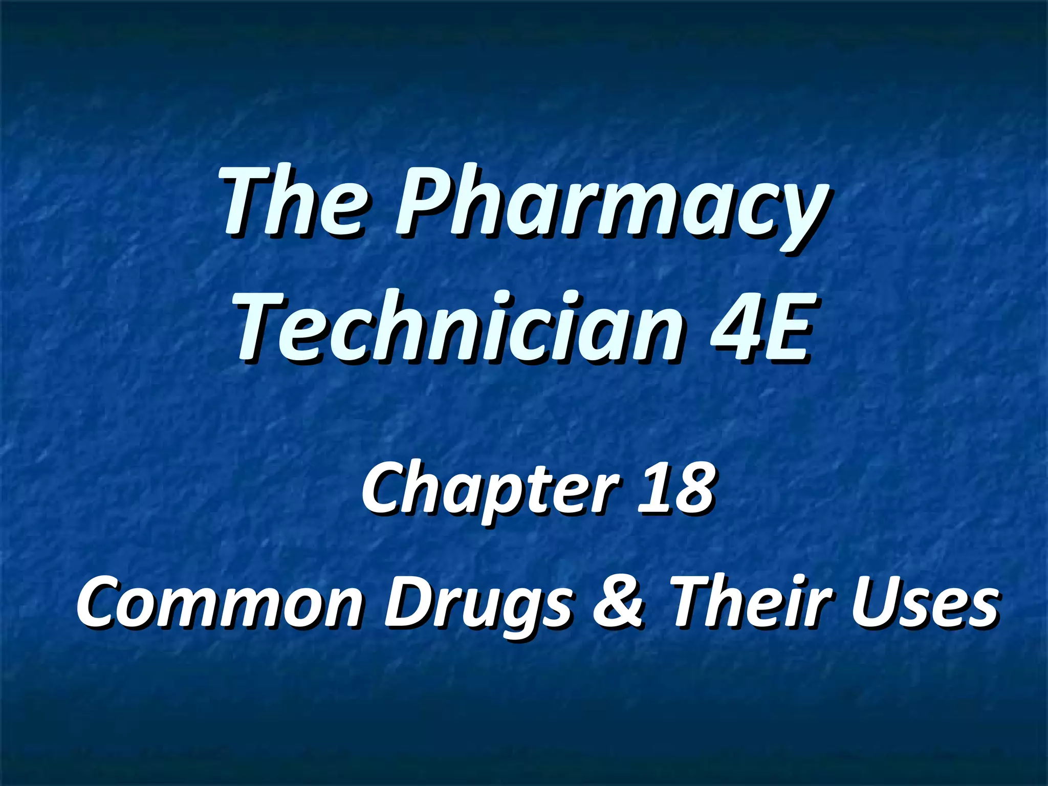 The document outlines the chapter topics and contents for Chapter 18 of The Pharmacy Technician 4E on common drugs and their uses. It provides classifications of drugs, examples of common drugs organized by therapeutic class, and brief descriptions of the drugs' indications. The major sections cover analgesics, anesthetics, anti-infectives, antineoplastics, cardiovascular agents, and others. Each section lists several example drugs and their generic and brand names.