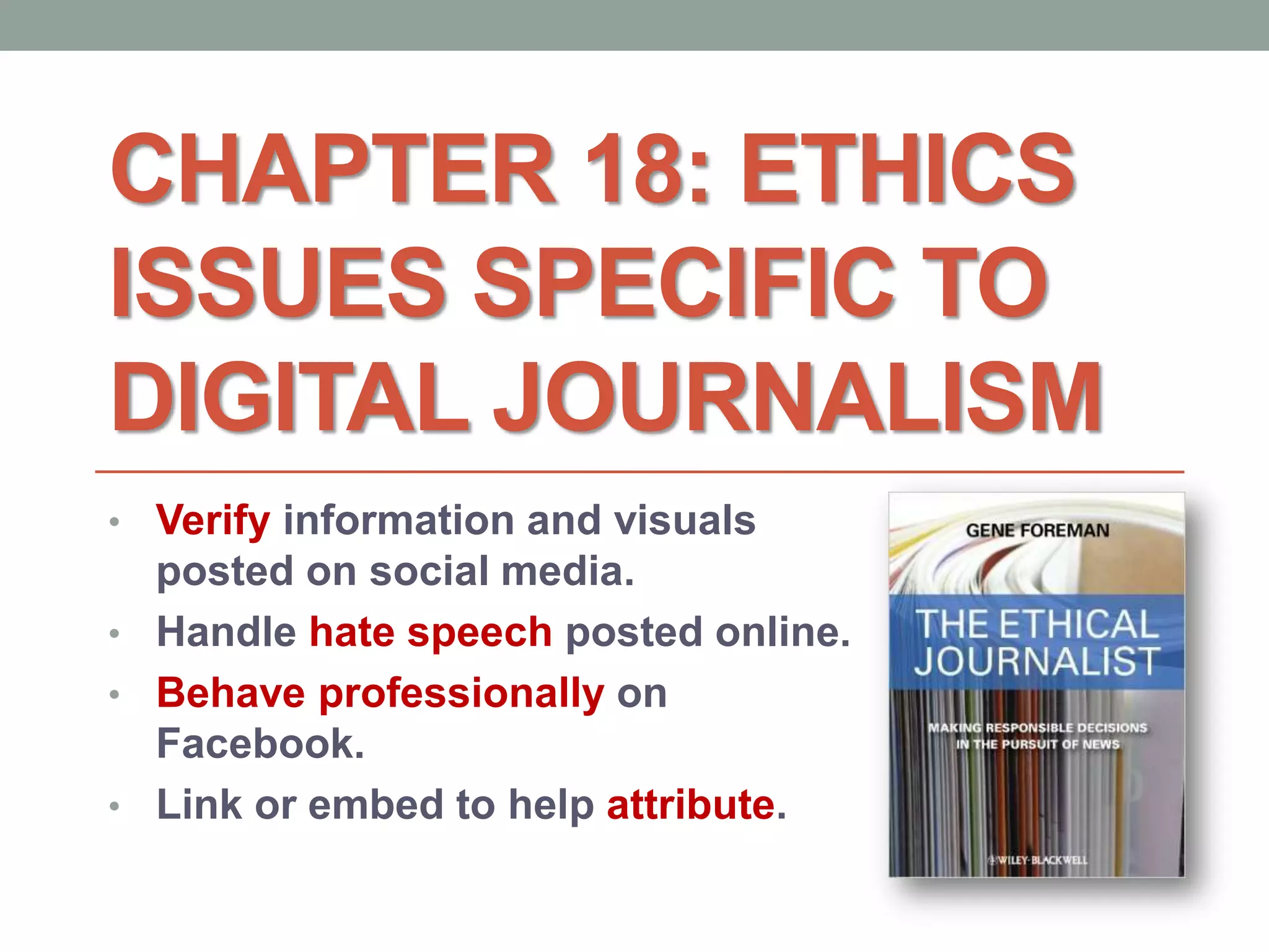 This document addresses the ethical issues in digital journalism, emphasizing the importance of verifying information from social media, handling hate speech, and maintaining professionalism online. It provides strategies for journalists to assess sources, verify content, and responsibly report on sensitive topics while avoiding the amplification of hate speech. Additionally, it highlights tools and best practices for attribution and linking in digital journalism.