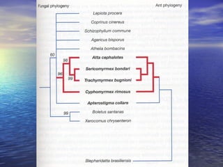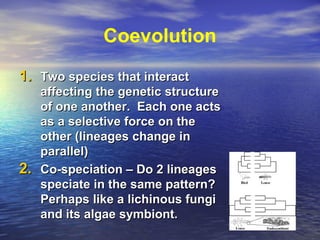 This document discusses various topics related to interactions among species and evolution of life history characters. Regarding interactions among species, it covers concepts like coevolution, different types of coevolution (specific, guild, escape-and-radiate, cospeciation), and using phylogenies to study questions like coevolution. It also discusses mimicry and provides examples of different types of mimicry (Mullerian, Batesian, Mertensian). Regarding life history characters, it discusses concepts like reproductive strategies, life history analysis, tradeoffs organisms face, and two theories for why organisms age and die.