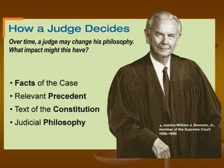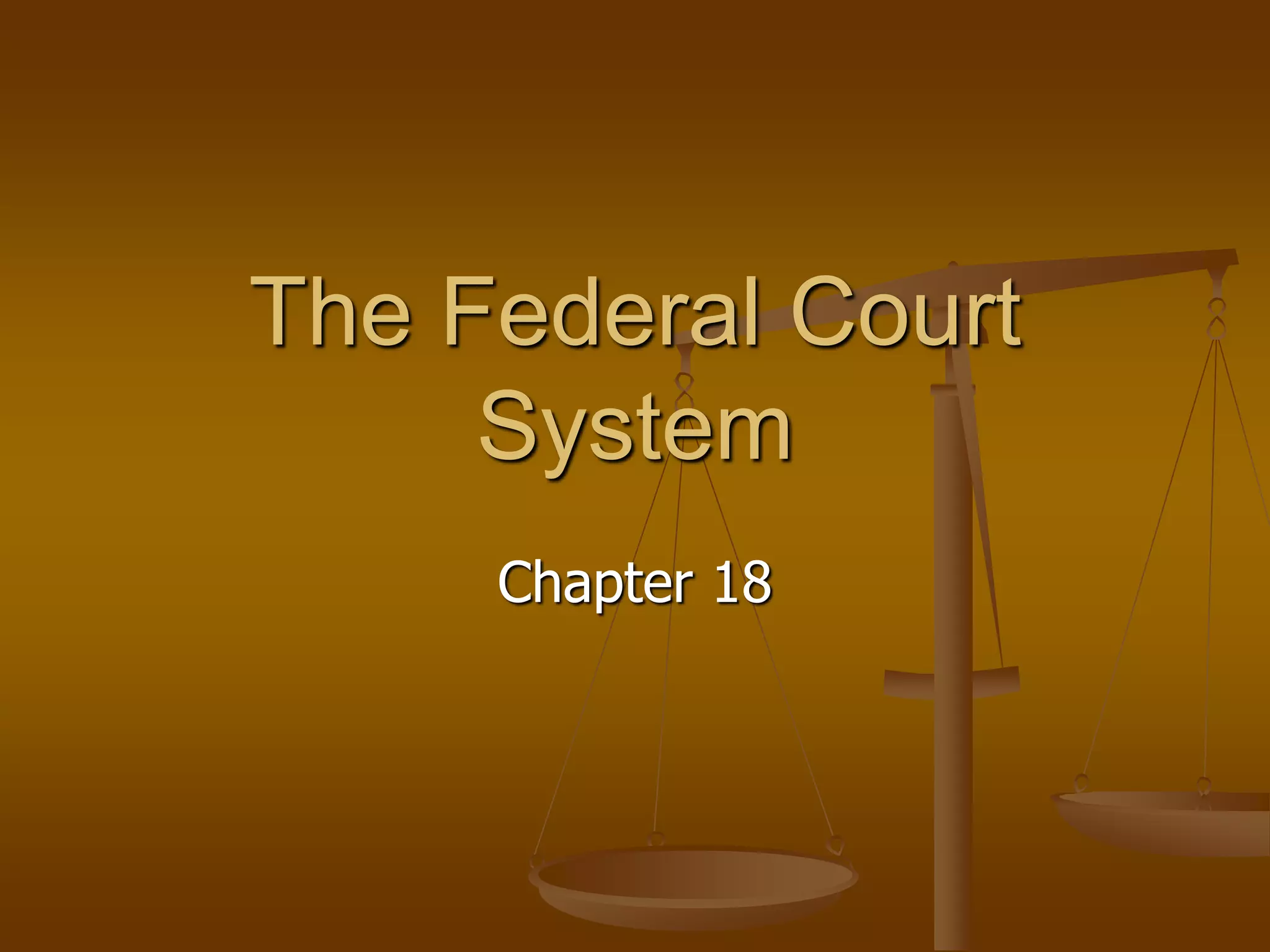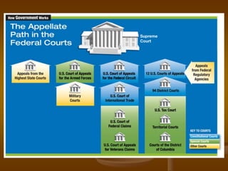 The document discusses the structure and jurisdiction of the United States federal court system. It describes the different types of federal courts, including constitutional courts like the Supreme Court and district courts, and special courts like the Court of Federal Claims and military courts. It explains that constitutional courts have broad jurisdiction over federal law while special courts have narrow jurisdictions over specific areas like veterans benefits or claims against the federal government.